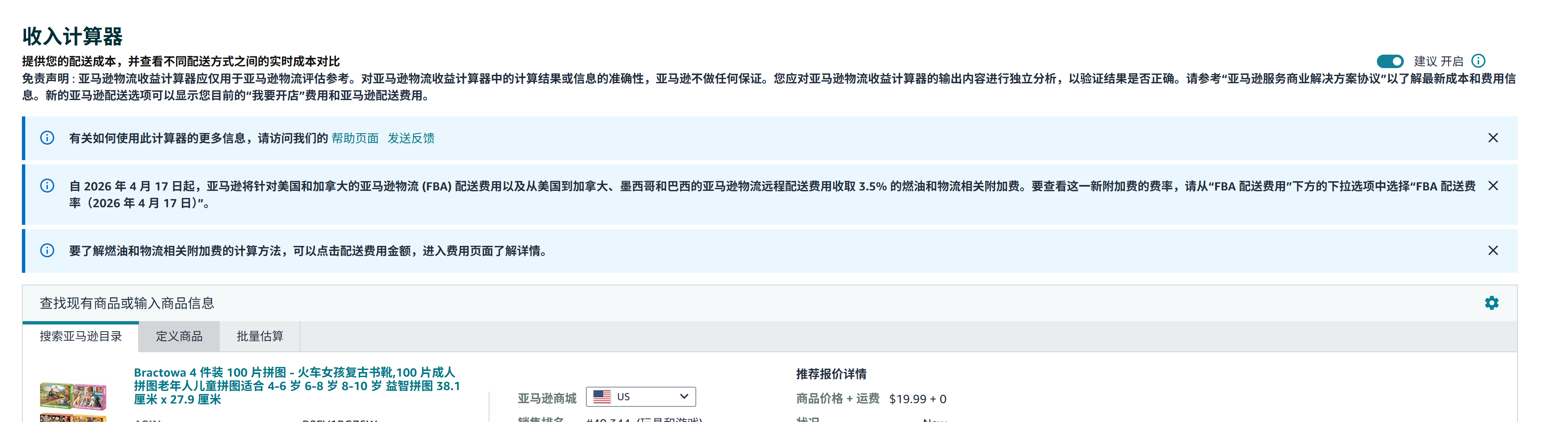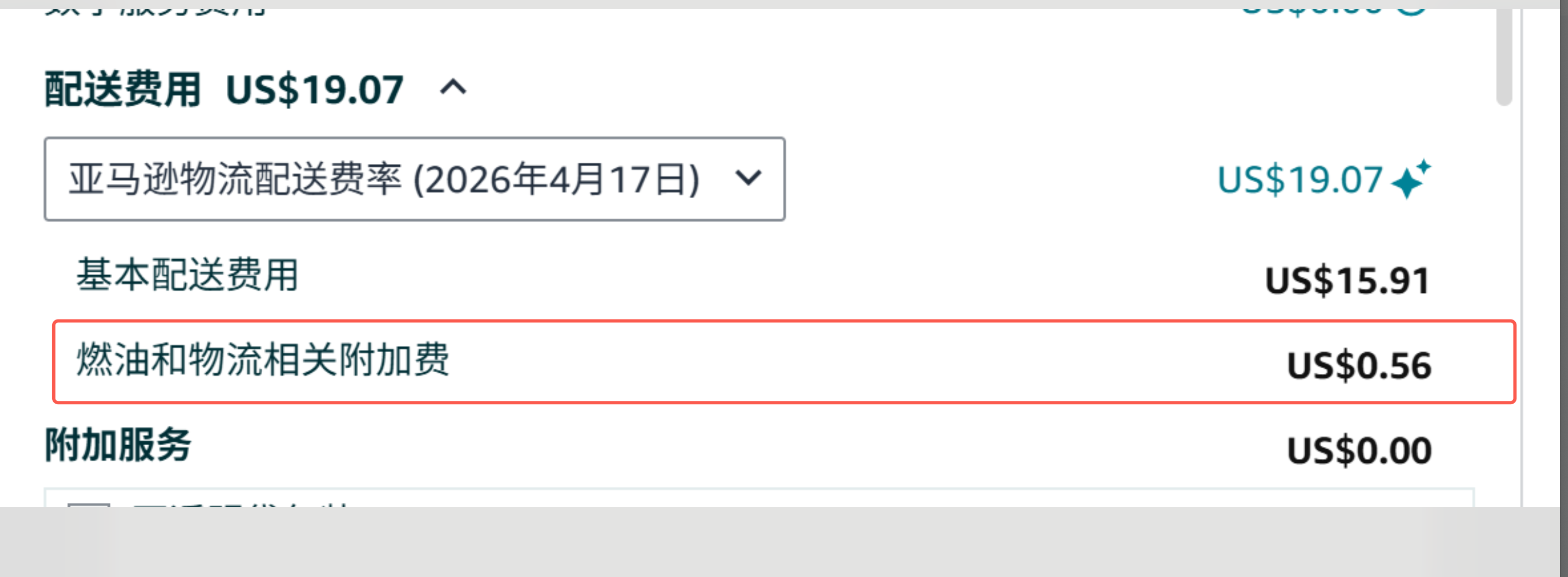 图中根据重量体积计算的基础配送费为$15.91,另外还有个外包装费用$2.6,从4月17号开始需要额外增加燃油费$15.91*3.5%=$0.56